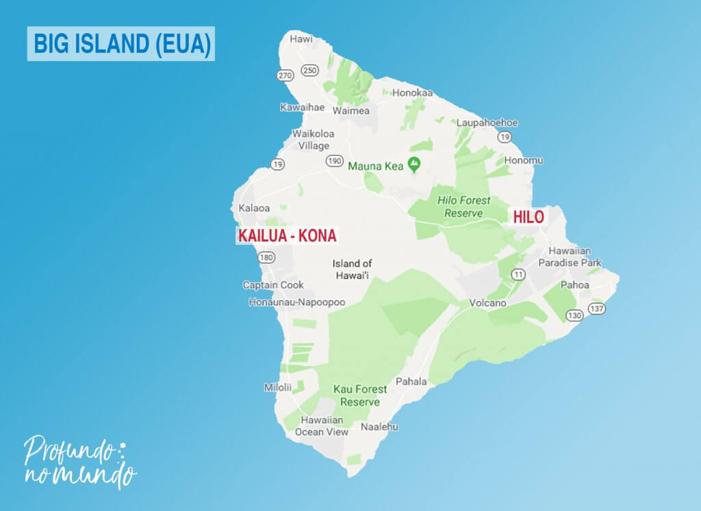 Dentro de Big Island existem várias regiões que, pra facilitar o entendimento aqui, podemos chamar de pequenas cidades. As mais conhecidas, e onde se encontram os 2 aeroportos principais da ilha, são Kailua-Kona e Hilo.