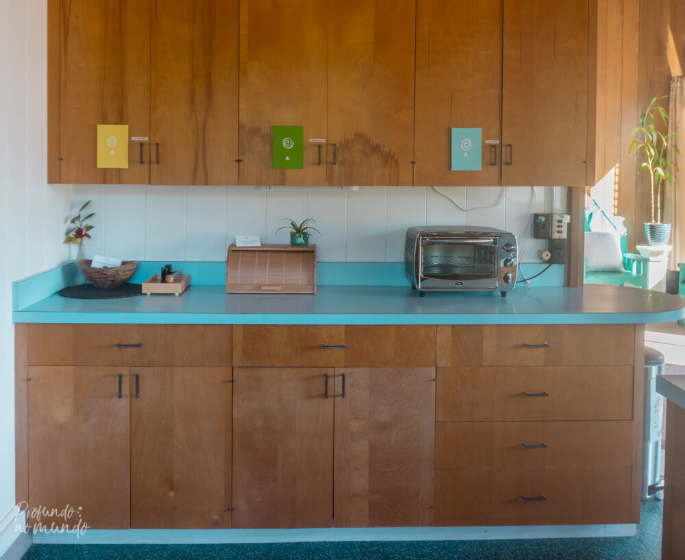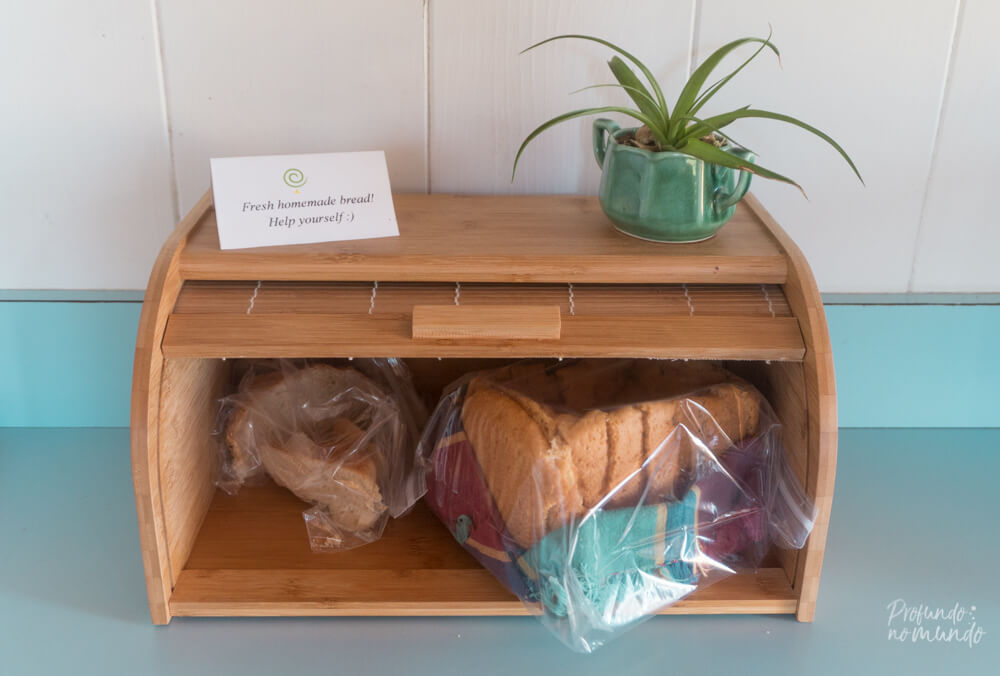 As meninas que trabalham lá nos receberam super bem, deram várias dicas do que fazer na região e fizeram nos sentir em casa, com um café-da-manhã cheio de frutas tropicais (orgânicas e colhidas localmente), pão caseiro feito por elas mesmas, além de suco, leite, peanut butter e geleias à disposição na geladeira da cozinha comunitária.