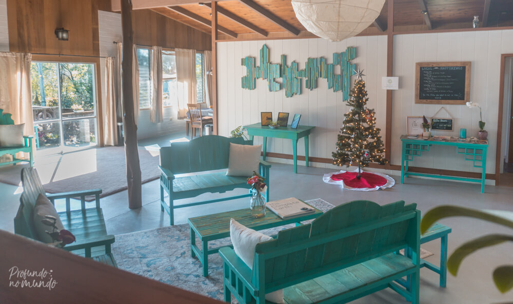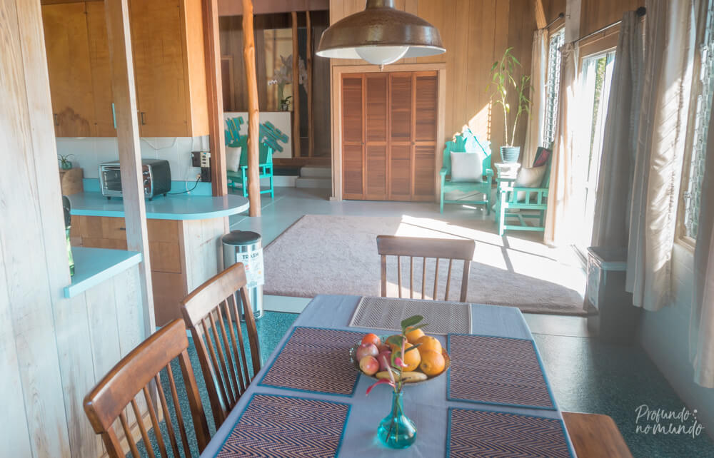 O que mais nos chamou atenção – e nos fez gostar ainda mais do lugar – é a consciência ambiental e respeito pela comunidade e pela natureza que eles tem, reciclando, reaproveitando e preferindo fornecedores locais, até mesmo na hora de decorar o ambiente, sendo que os móveis das áreas em comum – lindos, por sinal! – foram feitos por um artista da comunidade. E todo esse pensamento e filosofia se encaixam muito com o que nós também acreditamos e defendemos.